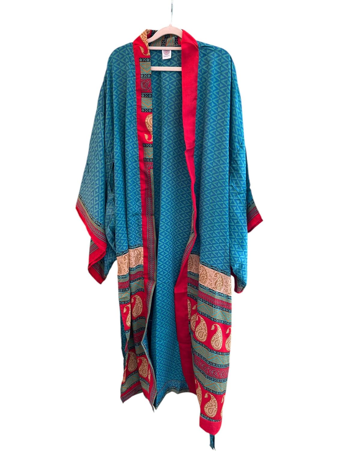 Kimono en seda, con cinturón, manga japonesa. Largo aprox 1,45 cm. Tejido fluido. Cada estampado es único